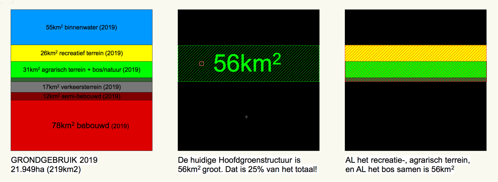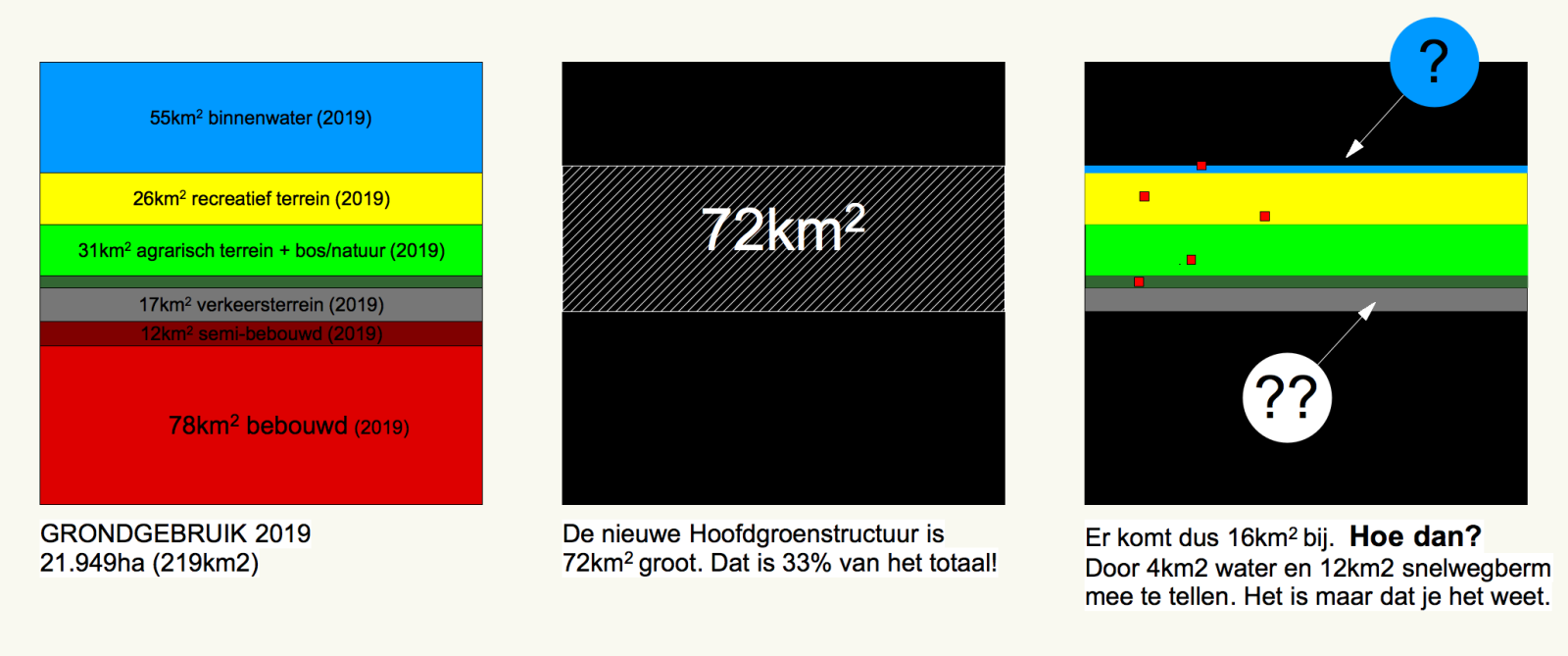 Het wordt gekker als we de claim van 72 km2 onderzoeken. Dat is een abstract getal en een toename van 56 naar 72 km2. Dat klinkt als een klok, maar als we het grafisch relateren aan het totale grondoppervlak dan zien we dat dit alleen kan als er water en verkeersterrein wordt meegeteld. Dat blijkt ook uit de gedetailleerde vergelijking die later wordt gemaakt, waarin per groentype de huidige en de toekomstige HGS wordt vergeleken.