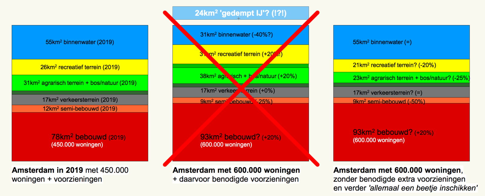 Het wordt NOG gekker als we ons realiseren dat Amsterdam minimaal 150.000 woningen bij wil bouwen, bovenop het bestaande aantal van 450.000 woningen. Voor al die extra woningen heb je ook extra grond nodig, extra wegen, extra groen, extra recreatieterrein. Dat ziet er dan zo uit als op onderstaande afbeelding. Links het bestaande areaal met 450.000 woningen. In het midden het benodigde areaal als je 33% bebouwing toevoegt. Rechts is te zien hoe de gemeente Amsterdam het wil aanpakken: ‘allemaal een beetje inschikken’.